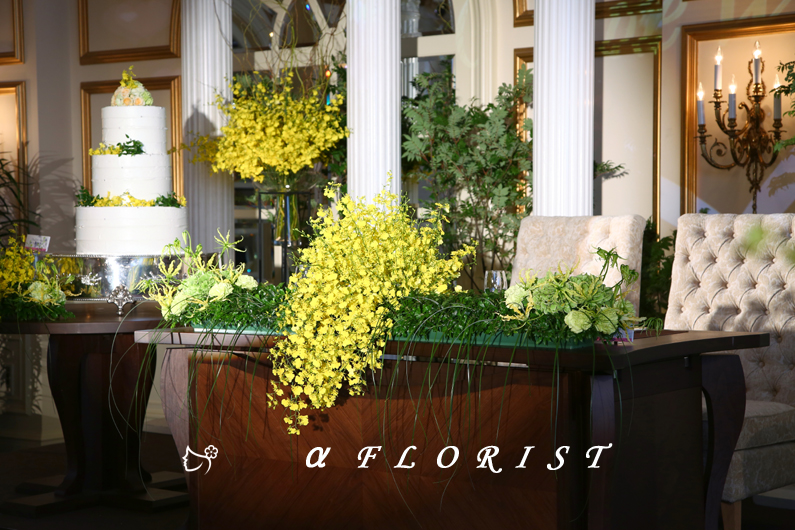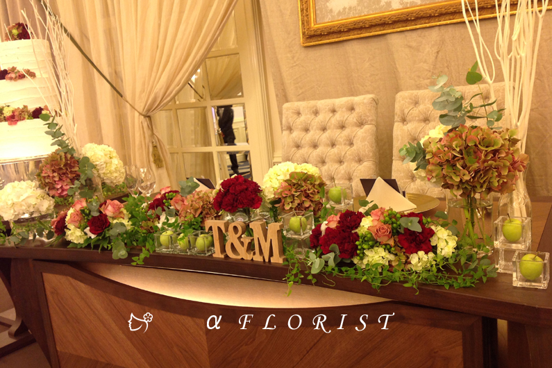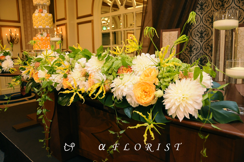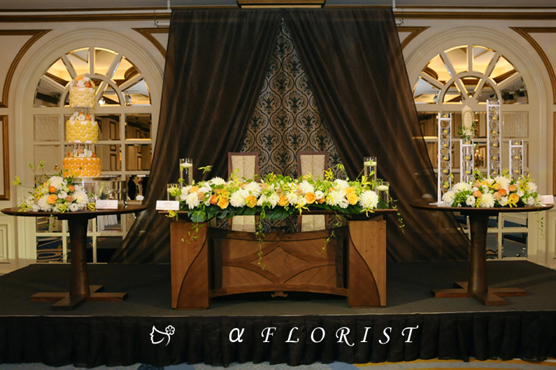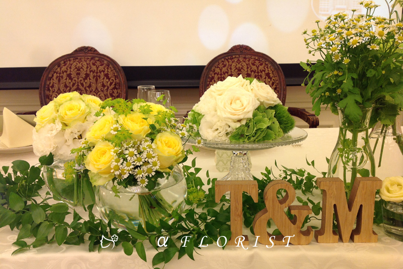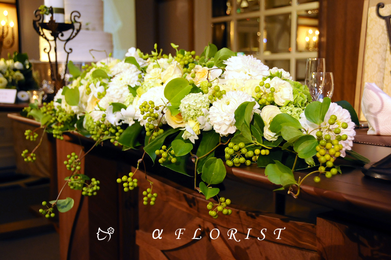 ブライダルのメインテーブルの作品をご紹介します。滋賀県彦根市の生花・フラワーアレンジメント専門店・アルファフローリスト。